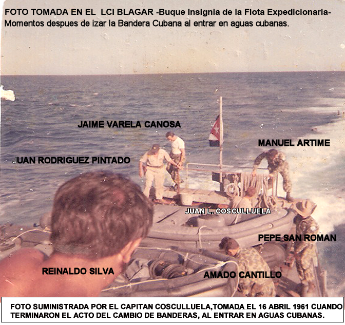 Estan presentes en ese historico acontecimiento, el Capitan Juan L. Cosculluela, el Comandante de la Brigada Jose Perez San Roman, el Dr. Manuel Artime Bueza, Jefe Civil de la Brigada, el Capitan de Corbeta Jaime Varela Canosa, Jefe de la Marina y el Teniente Medico Dr. Juan Rodriguez Pintado, medico del LCI Blagar.